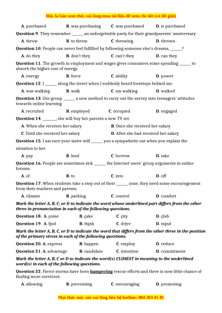 Question 22. Fierce storms have been hampering rescue efforts and there is now little chance of finding more survivors. A. allowing B. preventing C. encouraging D. promoting