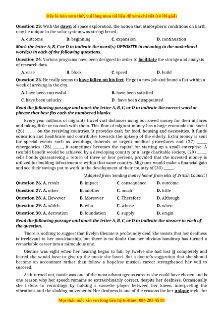 (Adapted from ‘sending money home’ from ielts of British Council.) Question 26. A. result B. impact C. consequence D. outcome