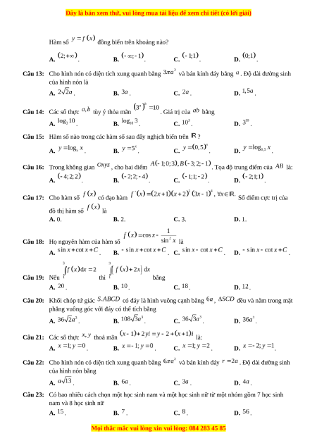 . Tọa độ trung điểm của là: A. . B. . C. . D. . Câu 17: Cho hàm số có đạo hàm