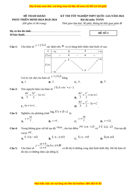 PHÁT TRIỂN MINH HỌA BGD 2024 Bài thi môn: TOÁN