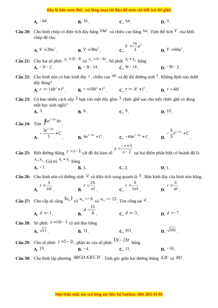 Câu 27: Cho cấp số cộng có và . Tìm công sai . A. . B. . C. . D. . Câu 28: Số phức có mô đun bằng A. . B. . C. . D. .