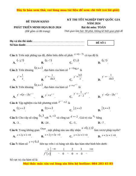 PHÁT TRIỂN MINH HỌA BGD 2024 Bài thi môn: TOÁN