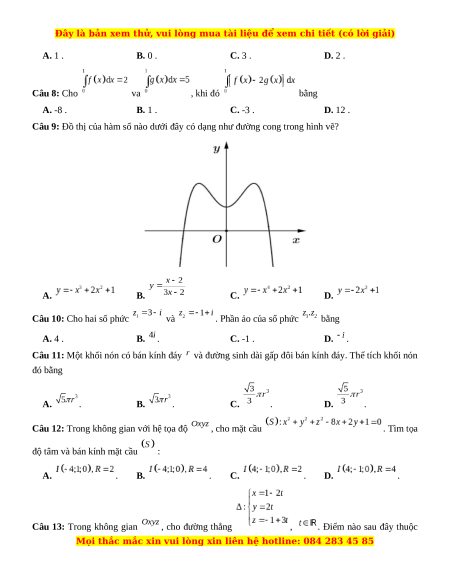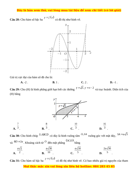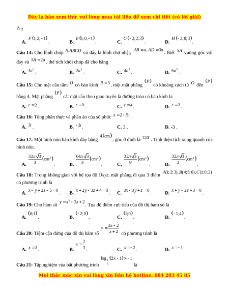 Câu 18: Trong không gian với hệ tọa độ Oxyz, mặt phẳng đi qua 3 điểm có phương trình là A. . B. . C. . D. . Câu 19: Cho hàm số