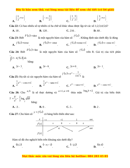 Câu 25: Họ tất cả các nguyên hàm của hàm số là A. . B. . C. . D. . Câu 26: Cho là số thực dương và thỏa mãn