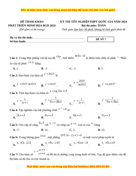 Đề Tốt nghiệp Toán 2024 theo đề tham khảo (Đề 7)