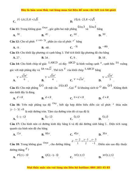 Câu 13: Cho khối lập phương có cạnh bằng 3. Thể tích khối lập phương đã cho bằng A. 27 . B. 54 . C. 9 . D. 18 .