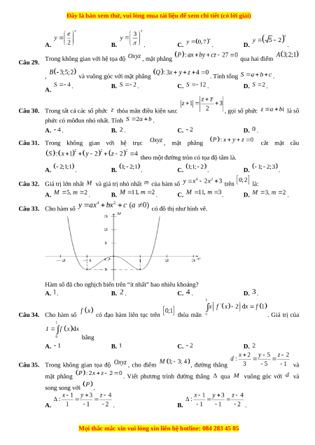 và giá trị nhỏ nhất của hàm số trên là: A. . B. . C. . D. . Câu 33. Cho hàm số