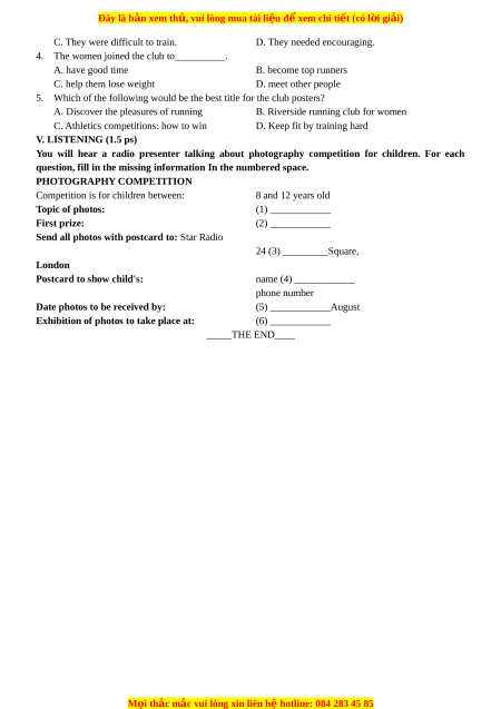 C. Athletics competitions: how to win D. Keep fit by training hard V. LISTENING (1.5 ps)