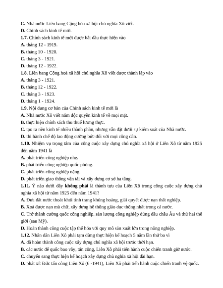 1.7. Chính sách kinh tế mới được bắt đầu thực hiện vào A. tháng 12 - 1919. B. tháng 10 - 1920. C. tháng 3 - 1921. D. tháng 12 - 1922.
