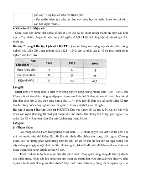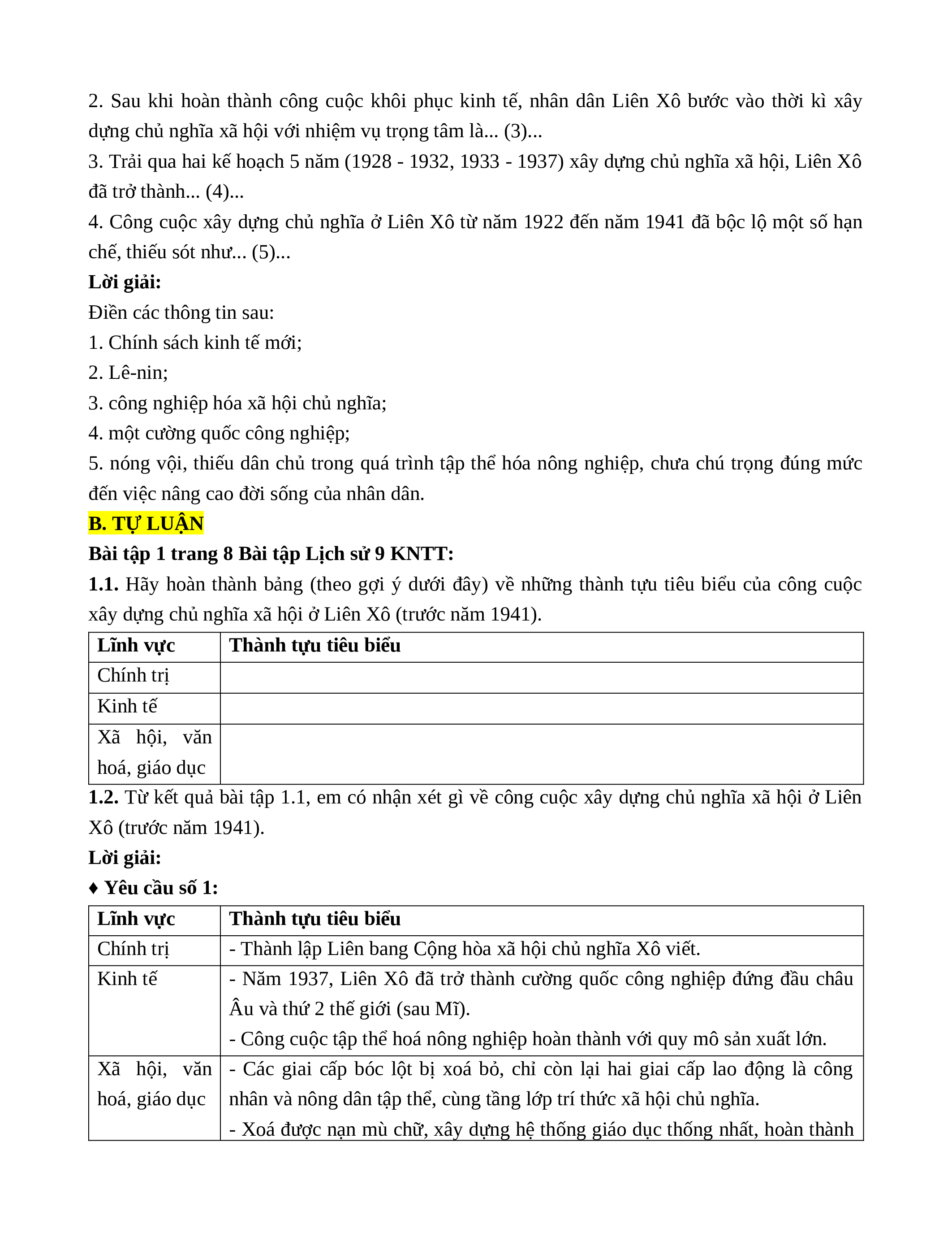 1.2. Từ kết quả bài tập 1.1, em có nhận xét gì về công cuộc xây dựng chủ nghĩa xã hội ở Liên Xô (trước năm 1941). Lời giải: ♦ Yêu cầu số 1: Lĩnh vực