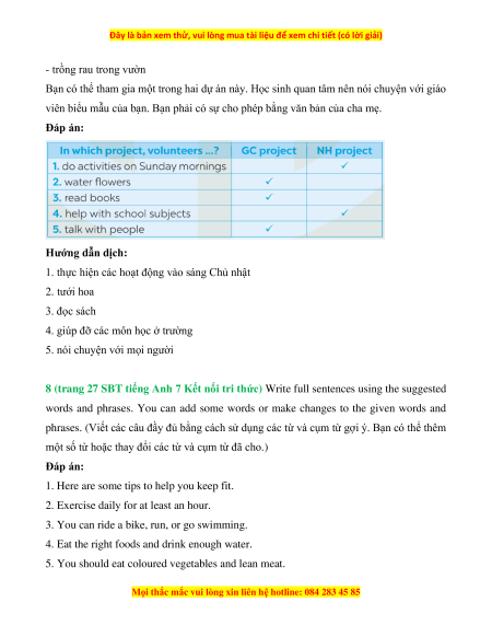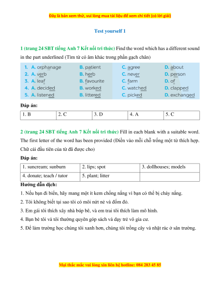 Chữ cái đầu tiên của từ đã được cho) Đáp án: 1. suncream; sunburn 2. lips; spot 3. dollhouses; models 4. donate; teach / tutor 5. plant; litter Hướng dẫn dịch: