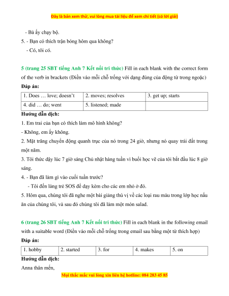 of the verb in brackets (Điền vào mỗi chỗ trống với dạng đúng của động từ trong ngoặc) Đáp án: 1. Does … love; doesn’t 2. moves; resolves 3. get up; starts 4. did … do; went 5. listened; made Hướng dẫn dịch:
