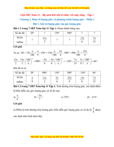 Bài 1.1 trang 7 SBT Toán lớp 11 Tập 1: Hoàn thành bảng sau: Số đo độ 20° ? 150° 500° ? ? Số đo 5 7 ? 11 ? ? rađian 2 6 15 Lời giải Ta có: 25 20 20. ; 5 150 150. ; 500 500. ; 180 9 180 6 180 9 11 11 180 . 990 ; 5 5 180 . 1 50 ; 7 7 180 . 84 . 2 2 6 6 15 15 Khi đó ta có Số đo độ 20° 990° 150° 500° – 150° 84° Số đo 11 5 25 5 7 rađian 9 2 6 9 6 15