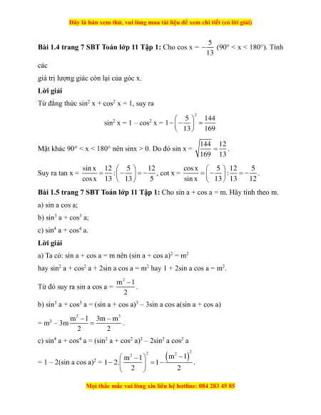 Mặt khác 90° < x < 180° nên sinx > 0. Do đó sin x = 144 12 . 1 9 6 3 1 Suy ra tan x = sin x 12 5 12 : , cot x = cos x 5 12 5 : . cos x 13 13 5 sin x 13 13 12