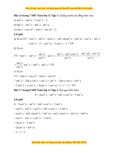 Bài 1.5 trang 7 SBT Toán lớp 11 Tập 1: Cho sin a + cos a = m. Hãy tính theo m. a) sin a cos a; b) sin3 a + cos3 a; c) sin4 a + cos4 a. Lời giải