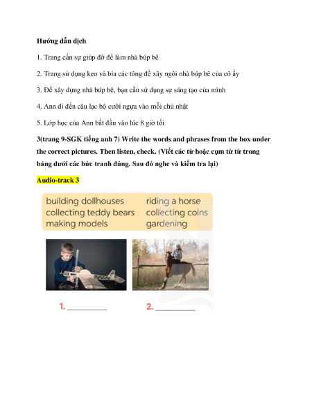 bảng dưới các bức tranh đúng. Sau đó nghe và kiểm tra lại) Audio-track 3 Đáp án 1. making models 2. riding a house 3. collecting coins 4. gardening 5. building dollhouses 6. collecting teddy bears Hướng dẫn dịch 1. tạo các mẫu 2. cưỡi ngựa 3. sưu tầm đồng xu 4. làm vườn 5. xâu nhà búp bê 6. sưu tầm gấu bông