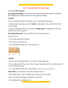 Bài 1. Tập h p. P ợ h n t ầ c ử a t ủ p h ậ p ợ A. Các câu h i ỏ trong bài Hoạt đ ng k ộ h i ở đ ng. ộ (Trang 7/SGK Chân tr i ờ sáng t o ạ Toán 6) B n ạ có thu c t ộ p ậ h p ợ nh ng h ữ c s ọ inh thích h c m ọ ôn toán trong l p ớ hay không? L i ờ giải: Tùy vào sở thích h c t ọ p ậ c a m ủ ỗi b n t ạ a s có ẽ câu tr l ả i ờ tư ng ơ ng: ứ +) N u em ế thích h c