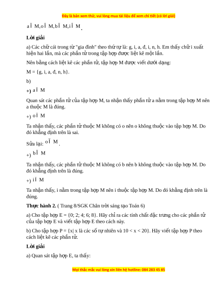 hiện hai lần, mà các phần t t ử rong t p h ậ p đ ợ ư c ợ li t ệ kê m t ộ l n. ầ Nên b ng cách ằ li t ệ kê các ph n t ầ , t ử p h ậ p M ợ đư c vi ợ t ế dư i ớ d ng: ạ M = {g, i, a, đ, n, h}. b) +) a Î M Quan sát các ph n t ầ c ử a ủ t p h ậ p ợ M, ta nh n ậ th y ph ấ n t ầ a n ử m ằ trong t p ậ h p M ợ nên a thu c ộ M là đúng. +) o Î M Ta nh n ậ thấy, các ph n t ầ t ử hu c M ộ