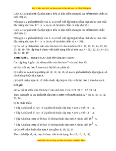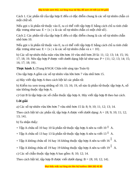 ơ 15 là: 8; 9; 10; 11; 12; 13; 14. Theo cách li t ệ kê các ph n t ầ , ử t p h ậ p ợ A đư c vi ợ t ế dư i ớ d ng: ạ A = {8; 9; 10; 11; 12; 13; 14}. b) Ta nh n ậ thấy: + T p ậ A ch a ứ s 10 hay 10 l ố à ph n t ầ t ử hu c t ộ p ậ h p ợ A nên ta vi t ế 10 Î A. + T p ậ A ch a ứ s 13 hay 13 l ố à ph n t ầ t ử hu c t ộ p ậ h p ợ A nên ta vi t ế 13 Î A. + T p ậ A không ch a ứ s 16 hay ố 16 không thu c ộ t p h ậ p ợ A nên ta vi t ế 16 Ï A. + T p ậ A không ch a ứ s 19 hay ố 19 không thu c ộ t p h ậ p ợ A nên ta vi t ế 19 Ï A. c) Các số ch n ẵ thu c t ộ p h ậ p ợ A bao g m ồ : 8; 10; 12; 14. Theo cách li t ệ kê, t p ậ h p B ợ đư c ợ vi t ế dư i ớ d ng: ạ B = {8; 10; 12; 14}.