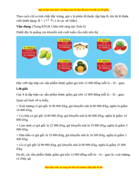 B = { x Î A | x là các số ch n}. ẵ Vận d ng. ụ (Trang 8/SGK Chân tr i ờ sáng t o ạ Toán 6) Dư i ớ đây là qu ng cáo ả khuy n m ế ãi cu i ố tu n c ầ a ủ m t ộ siêu th .ị Hãy vi t ế t p h ậ p các ợ s n ả ph m ẩ đư c ợ gi m ả giá trên 12 000 đ ng m ồ i ỗ ki – lô – gam. L i ờ giải G i ọ A là t p ậ h p các s ợ n ph ả m ầ đư c ợ gi m ả giá trên 12 000 đ ng m ồ i ỗ ki – lô – gam. Quan sát hình v t ẽ a th y ấ , + Xoài tư ng ợ có giá g c l