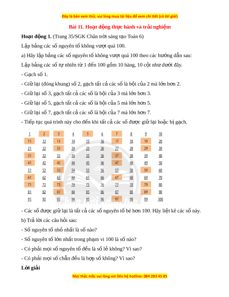 ả các số tự nhiên t 1 đ ừ n 100 g ế m ồ 10 hàng, 10 c t ộ nh d ư ư i ớ đây. - G ch ạ s 1. ố - Gi l ữ i ạ (đóng khung) s 2, g ố ch t ạ t ấ c các s ả l ố à b i ộ c a 2 m ủ à l n h ớ n ơ 2. - Gi l ữ i ạ số 3, g ch t ạ ất c các ả số là b i ộ c a ủ 3 mà l n h ớ n 3. ơ - Gi l ữ i ạ số 5, g ch t ạ ất c các ả số là b i ộ c a ủ 5 mà l n h ớ n 5. ơ - Gi l ữ i ạ số 7, g ch t ạ ất c các ả số là b i ộ c a ủ 7 mà l n h ớ n 7. ơ - Ti p t ế c quá t ụ rình này cho đ n khi ế t t ấ cả các số đư c ợ gi l ữ i ạ ho c ặ b g ị ch. ạ - Các số đư c gi ợ l ữ i ạ là t t ấ c các ả s nguyên t ố bé h ố n 100. H ơ ãy li t ệ kê các số này. b) Tr l ả i ờ các câu h i ỏ sau: - Số nguyên tố nh nh ỏ t ấ là s nào? ố - Số nguyên tố l n nh ớ t ấ trong ph m ạ vi 100 là s nào? ố - Có ph i ả m i ọ số nguyên tố đ u l ề à số l không? ẻ Vì sao? - Có ph i ả m i ọ số ch n ẵ đ u l ề à h p s ợ không? ố Vì sao? L i ờ giải