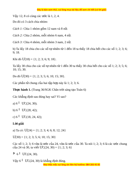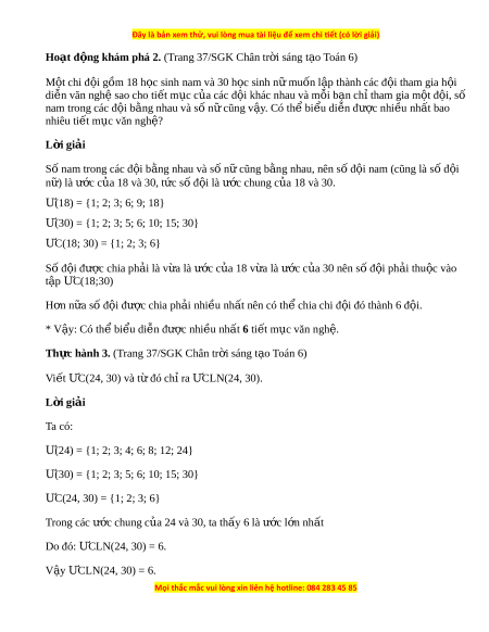 hám phá 2. (Trang 37/SGK Chân tr i ờ sáng t o ạ Toán 6) M t ộ chi đ i ộ gồm 18 h c s ọ inh nam và 30 h c s ọ inh n m ữ u n l ố p ậ thành các đ i ộ tham gia h i ộ di n văn ễ nghệ sao cho ti t ế m c c ụ a ủ các đ i ộ khác nhau và m i ỗ b n ch ạ t ỉ ham gia m t ộ đ i ộ , số nam trong các đ i ộ b ng nhau và s ằ ố n cũng v ữ y ậ . Có th bi ể u di ể n đ ễ ư c ợ nhi u ề nh t ấ bao nhiêu ti t ế m c ụ văn ngh ? ệ L i ờ giải Số nam trong các đ i ộ b ng ằ nhau và s n ố cũng b ữ ng ằ nhau, nên s đ ố i ộ nam (cũng là số đ i ộ n ) ữ là ư c ớ c a 18 và 30, t ủ c ứ s đ ố i ộ là ư c ớ chung c a 18 và 30. ủ Ư(18) = {1; 2; 3; 6; 9; 18}
