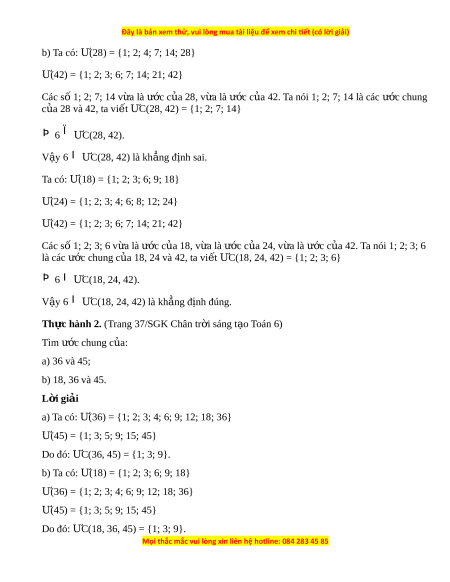 ủ 42. Ta nói 1; 2; 7; 14 là các ư c chung ớ c a ủ 28 và 42, ta vi t ế C Ư (28, 42) = {1; 2; 7; 14} Þ 6 Ï C Ư (28, 42). V y ậ 6 Î C Ư (28, 42) là kh ng ẳ đ nh s ị ai. Ta có: ( Ư 18) = {1; 2; 3; 6; 9; 18}