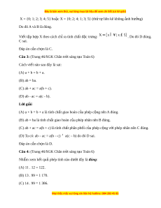 Câu 2: (Trang 46/SGK Chân tr i ờ sáng t o ạ Toán 6) G i ọ X là t p h ậ p các ợ s t ố nhi ự ên không l n h ớ n ơ 5. Cách vi t ế sai là: (A) X = {0; 1; 2; 3; 4; 5}. (B) X = {0; 2; 4; 1; 3; 5}. (C) X= {x ∈ ¥ | x < 5}. (D) X = {x ∈ ¥ | x ≤ 5}. L i ờ giải Các số t nhi ự n không l ệ n h ớ n 5, t ơ c ứ là nh h ỏ n ho ơ c ặ b ng 5, đó l ằ à các s 0, 1, 2, 3, 4, ố 5. Khi đó ta vi t ế t p ậ h p X ợ theo cách li t ệ kê các ph n t ầ l ử à: