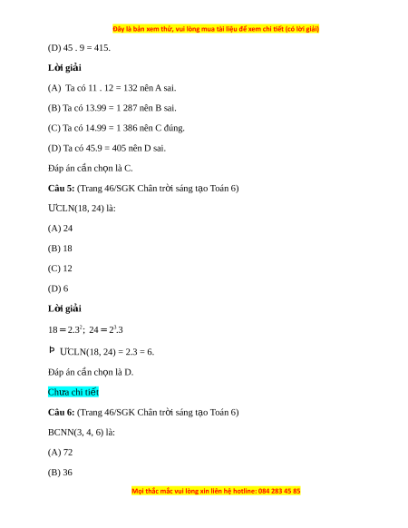 Câu 5: (Trang 46/SGK Chân tr i ờ sáng t o ạ Toán 6) ƯCLN(18, 24) là: (A) 24 (B) 18 (C) 12 (D) 6 L i ờ giải 2 3 18 = 2.3 ; 24 = 2 .3 Þ ƯCLN(18, 24) = 2.3 = 6. Đáp án c n ch ầ n l ọ à D. Chưa chi ti t ế