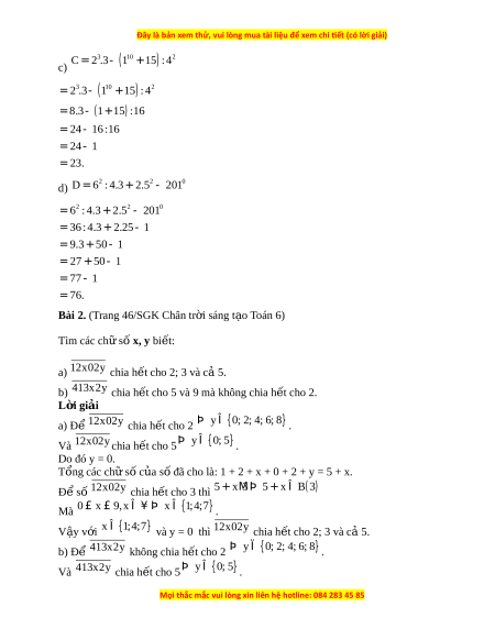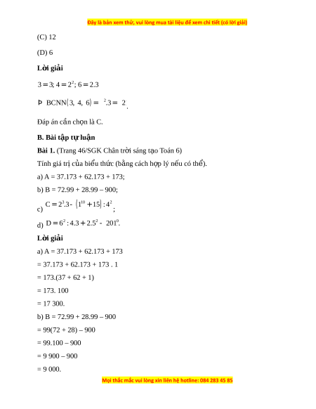 Bài 1. (Trang 46/SGK Chân tr i ờ sáng t o ạ Toán 6) Tính giá tr c ị a ủ bi u ể th c ( ứ b ng ằ cách h p ợ lý n u có t ế h ) ể . a) A = 37.173 + 62.173 + 173; b) B = 72.99 + 28.99 – 900; 3 = - ( 10 + ) 2 C 2 .3 1 15 : 4 c) ; 2 2 0 d) D = 6 : 4.3 +2.5 - 201 . L i ờ giải a) A = 37.173 + 62.173 + 173 = 37.173 + 62.173 + 173 . 1 = 173.(37 + 62 + 1) = 173. 100 = 17 300. b) B = 72.99 + 28.99 – 900 = 99(72 + 28) – 900 = 99.100 – 900 = 9 900 – 900 = 9 000.