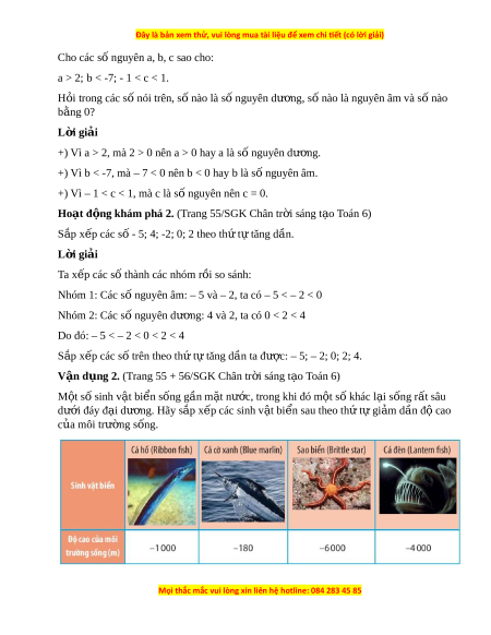 Do đó: – 5 < – 2 < 0 < 2 < 4 S p ắ x p các s ế ố trên theo th t ứ t ự ăng d n t ầ a đư c: ợ – 5; – 2; 0; 2; 4. Vận d ng 2. ụ (Trang 55 + 56/SGK Chân tr i ờ sáng t o ạ Toán 6) M t ộ số sinh v t ậ bi n s ể ống g n m ầ t ặ nư c, ớ trong khi đó m t ộ số khác l i ạ s ng r ố t ấ sâu dư i ớ đáy đ i ạ dư ng. ơ Hãy s p ắ x p các ế sinh v t ậ bi n s ể au theo th t ứ gi ự m ả d n đ ầ cao ộ c a ủ môi trư ng ờ s ng. ố