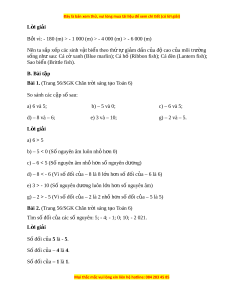 Thực hành 1. (Trang 55/SGK Chân tr i ờ sáng t o ạ Toán 6) So sánh các c p ặ s nguyên s ố au: a) – 10 và – 9; b) 2 và – 15; c) 0 và – 3. L i ờ giải a) Trên tr c ụ s , t ố a th y s ấ – 10 n ố m ằ bên ở trái s – 9 nên ố – 10 < - 9. b) Trên tr c ụ số, ta th y s ấ ố – 15 n m ằ bên t ở rái s 2 nên ố – 15 < 2 hay 2 > - 15. c) Trên tr c ụ s , t ố a th y s ấ - ố 3 n m ằ bên trái s 0 nên ố – 3 < 0 hay 0 > - 3. Vận d ng 1. ụ (Trang 55/SGK Chân tr i ờ sáng t o ạ Toán 6)