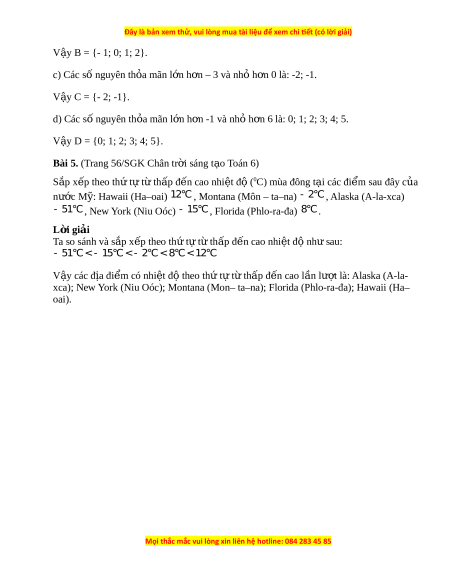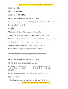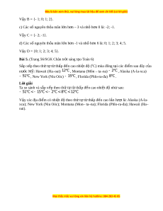 c) C ={c ∈ Z | - 3 < c < 0}; d) D ={d ∈ Z | - 1 < d < 6}. L i ờ giải a) Các số nguyên th a ỏ mãn l n h ớ n - ơ 4 và nh h ỏ n - ơ 1 là: -3; -2. V y ậ A = {- 3; - 2}. b) Các số nguyên th a m ỏ ãn l n h ớ n ơ -2 và nhỏ h n 3 l ơ à: -1; 0; 1; 2.
