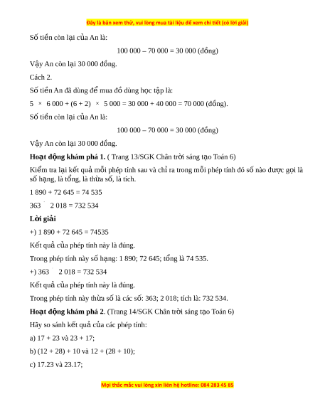 hám phá 1. ( Trang 13/SGK Chân tr i ờ sáng t o ạ Toán 6) Ki m ể tra l i ạ k t ế qu m ả i ỗ phép tính sau và ch r ỉ a trong m i ỗ phép tính đó s nào đ ố ư c ợ g i ọ là số h ng, ạ là tổng, là th a s ừ ố, là tích. 1 890 + 72 645 = 74 535 363 ´ 2 018 = 732 534 L i ờ giải +) 1 890 + 72 645 = 74535 K t ế quả c a phép ủ tính này là đúng.