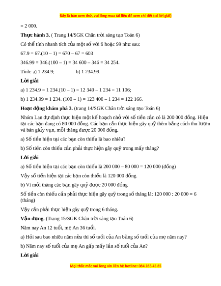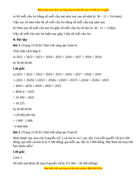 ố háng là: 120 000 : 20 000 = 6 (tháng) V y ậ c n ph ầ i ả th c hi ự n gây qu ệ t ỹ rong 6 tháng. Vận d ng. ụ (Trang 15/SGK Chân tr i ờ sáng t o ạ Toán 6) Năm nay An 12 tu i ổ , m ẹ An 36 tu i ổ . a) H i ỏ sau bao nhiêu năm n a ữ thì số tu i ổ c a ủ An b ng s ằ ố tu i ổ c a ủ m năm ẹ nay? b) Năm nay số tu i ổ c a m ủ ẹ An g p m ấ y l ấ n s ầ t ố u i ổ c a ủ An? L i ờ giải