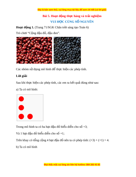 Bài 5. Ho t ạ đ ng t ộ h c hà ự ng và tr i ả nghi m ệ VUI H C Ọ CÙNG S N Ố GUYÊN Hoạt đ ng 1. ộ (Trang 71/SGK Chân tr i ờ sáng t o ạ Toán 6) Trò ch i ơ “C ng ộ đ u đ ậ , đ ỏ u ậ đen”. Các nhóm sử d ng m ụ ô hình đ t ể h c hi ự n các phép t ệ ính. L i ờ giải Sau khi th c hi ự n các ệ phép tính, các em ra k t ế qu đúng nh ả s ư au: a) Ta có mô hình: Trong mô hình ta có ba h t ạ đ u ậ đ bi ỏ u di ể n cho s ễ +3; ố Và 1 h t ạ đ u đ ậ ỏ bi u di ể n cho s ễ ố +1; Trên khay có tổng c ng 4 h ộ t ạ đ u ậ đ nên t ỏ