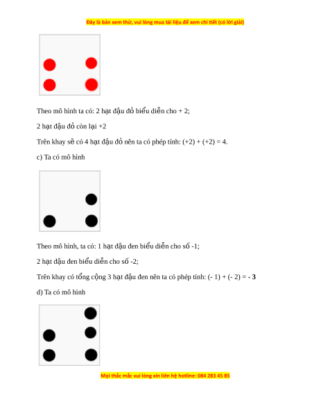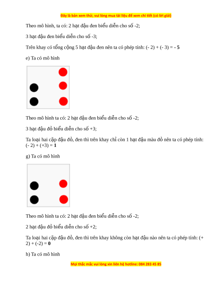 ậ đen nên ta có phép tính: (- 2) + (- 3) = - 5 e) Ta có mô hình Theo mô hình ta có: 2 h t ạ đ u ậ đen bi u di ể n cho s ễ ố -2; 3 h t ạ đ u đ ậ bi ỏ u ể di n ễ cho s +3; ố Ta lo i ạ hai c p đ ặ u ậ đ , đen t ỏ hì trên khay ch còn 1 h ỉ t ạ đ u ậ màu đ nên t ỏ a có phép tính: (- 2) + (+3) = 1 g) Ta có mô hình Theo mô hình ta có: 2 h t ạ đ u ậ đen bi u di ể n cho s ễ ố -2; 2 h t ạ đ u đ ậ bi ỏ u ể di n ễ cho s +2; ố Ta lo i ạ hai c p đ ặ u ậ đ , đen t ỏ hì trên khay không còn h t ạ đ u