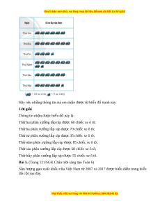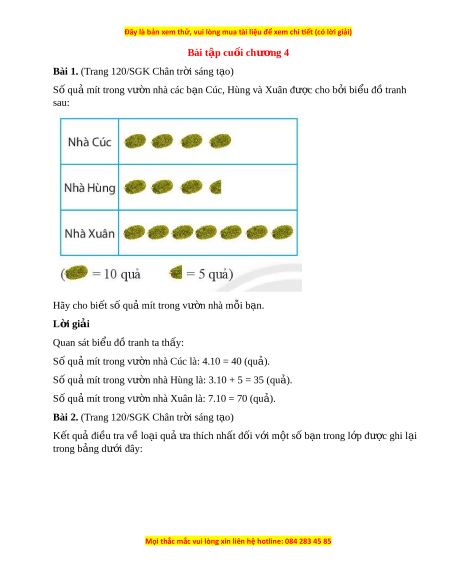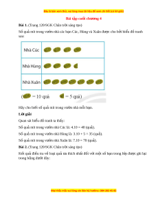 Bài 1. (Trang 120/SGK Chân tr i ờ sáng t o) ạ Số qu m ả ít trong vư n nhà các ờ b n C ạ úc, Hùng và Xuân đư c ợ cho b i ở bi u đ ể t ồ ranh sau: Hãy cho bi t ế số qu m ả ít trong vư n nhà m ờ i ỗ b n. ạ L i ờ giải Quan sát bi u đ ể ồ tranh ta th y: ấ Số qu m ả ít trong vư n nhà C ờ úc là: 4.10 = 40 (qu ) ả . Số qu m ả ít trong vư n nhà H ờ ùng là: 3.10 + 5 = 35 (qu ) ả . Số qu m ả ít trong vư n nhà X ờ uân là: 7.10 = 70 (qu ) ả .