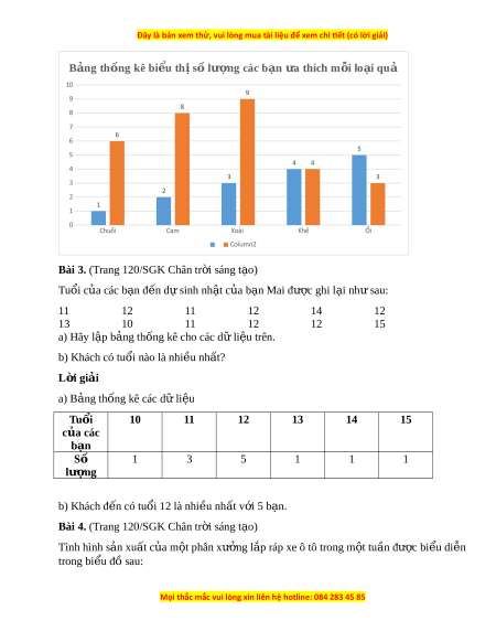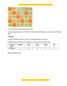 a) Có bao nhiêu b n đã t ạ ham gia tr l ả i ờ ? b) L p b ậ ng t ả hống kê và vẽ bi u đ ể ồ c t ộ bi u t ể hị số lư ng các ợ b n ạ a ư thích m i ỗ lo i ạ qu . ả L i ờ giải a) Quan sát b ng và ả đ m ế , ta th y có ấ 30 b n đã t ạ ham gia tr l ả i ờ . b) B ng ả thống kê bi u ể th s ị l ố ư ng ợ các b n ạ a t ư hích m i ỗ lo i ạ quả Các loại Chu i ố Cam Xoài Khế i ổ quả Số lư ng ợ 6 8 9 4 3 Bi u ể đồ tư ng ơ ng: ứ