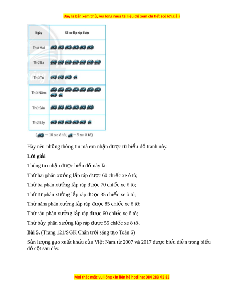 Hãy nêu nh ng t ữ hông tin mà em nh n đ ậ ư c ợ t bi ừ u đ ể t ồ ranh này. L i ờ giải Thông tin nh n đ ậ ư c ợ bi u đ ể này ồ là: Th hai ứ phân xư ng ở l p r ắ áp đư c 60 chi ợ c ế xe ô tô; Th ba phân x ứ ư ng ở l p r ắ áp đư c 70 chi ợ c ế xe ô tô; Th t ứ phân x ư ư ng ờ l p r ắ áp đư c 35 chi ợ c ế xe ô tô; Th năm ứ phân xư ng ờ l p r ắ áp đư c 85 chi ợ c ế xe ô tô; Th s ứ áu phân xư ng l ở p ắ ráp đư c ợ 60 chi c xe ế ô tô; Th b ứ y phân ả xư ng l ở p r ắ áp đư c ợ 55 chi c xe ô t ế ô.