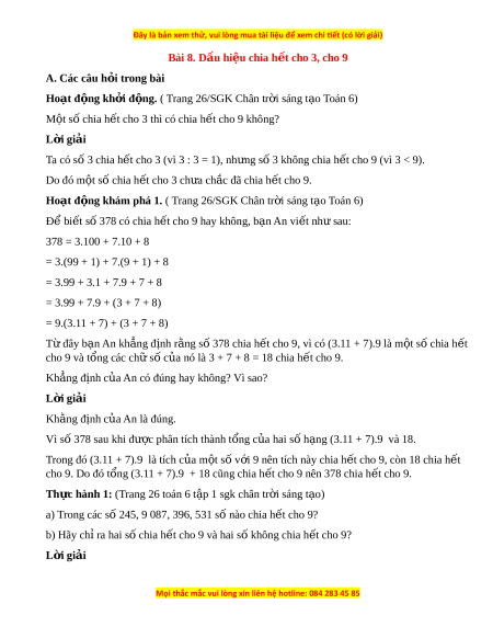 Bài 8. Dấu hi u chi ệ a h t ế cho 3, cho 9 A. Các câu h i ỏ trong bài Hoạt đ ng k ộ h i ở đ ng. ộ ( Trang 26/SGK Chân tr i ờ sáng t o ạ Toán 6) M t ộ số chia h t ế cho 3 thì có chia h t ế cho 9 không? L i ờ giải Ta có số 3 chia h t