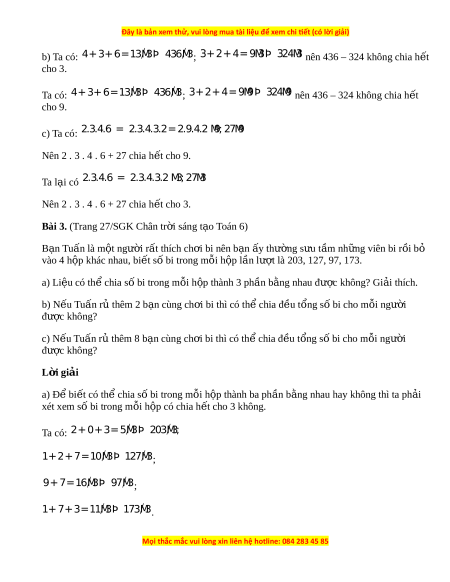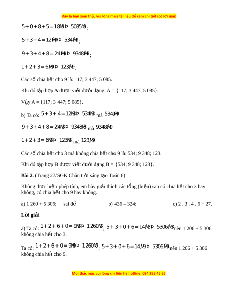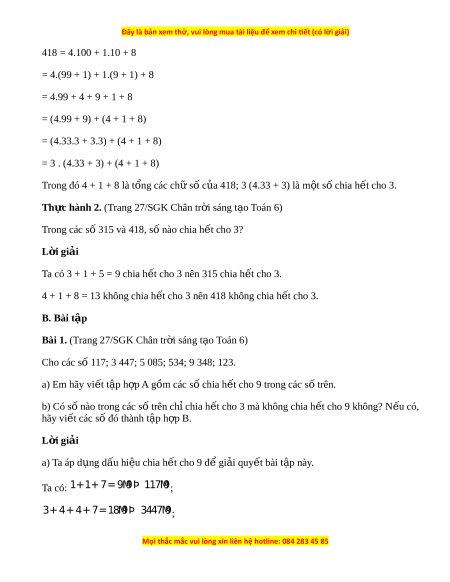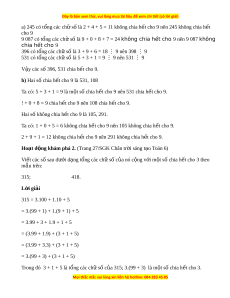 ế cho 9 là: 117; 3 447; 5 085. Khi đó t p ậ h p ợ A đư c vi ợ t ế dư i ớ d ng: ạ A = {117; 3 447; 5 085}. V y ậ A = {117; 3 447; 5 085}. b) Ta có: + 5 + 3 4=1 M 2 3Þ 53 M 4 3 mà 53 M 4 9 9+ + 3 4+8=2 M 4 3Þ 934 M 8 3 mà 934 M 8 9 + 1 2+3= M 6 Þ 3 12 M 3 3 mà 12 M 3 9 Các số chia h t ế cho 3 mà không chia h t