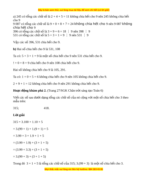 Bài 2. (Trang 27/SGK Chân tr i ờ sáng t o ạ Toán 6) Không th c ự hi n phép ệ tính, em hãy gi i ả thích các t ng ( ổ hi u) ệ sau có chia h t ế cho 3 hay không, có chia h t ế cho 9 hay không.