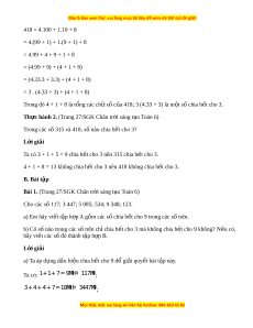 ổng các chữ số c a nó c ủ ng ộ v i ớ m t ộ số chia h t ế cho 3 theo mẫu trên: 315; 418. L i ờ giải 315 = 3.100 + 1.10 + 5 = 3.(99 + 1) + 1.(9 + 1) + 5 = 3.99 + 3 + 1.9 + 1 + 5 = (3.99 + 1.9) + (3 + 1 + 5) = (3.99 + 3.3) + (3 + 1 + 5) = 3.(99 + 3) + (3 + 1 + 5)