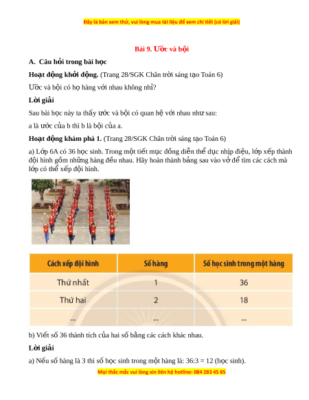 Bài 9. Ư c ớ và b i ộ A. Câu h i ỏ trong bài h c ọ Hoạt đ ng k ộ h i ở đ ng. ộ (Trang 28/SGK Chân tr i ờ sáng t o ạ Toán 6) c Ướ và b i ộ có h hàng ọ v i ớ nhau không nhỉ? L i ờ giải Sau bài h c ọ này ta th y ấ ư c và b ớ i ộ có quan h v ệ i ớ nhau nh s ư au: a là ư c c ớ a ủ b thì b là b i ộ c a a. ủ Hoạt đ ng k ộ