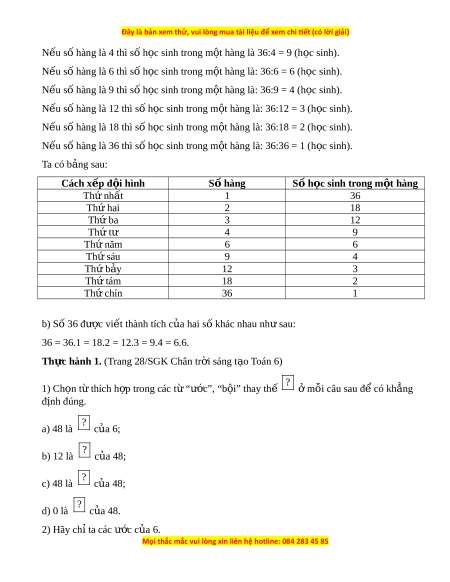 hám phá 1. (Trang 28/SGK Chân tr i ờ sáng t o ạ Toán 6) a) L p 6A ớ có 36 h c ọ sinh. Trong m t ộ ti t ế m c đ ụ ng di ồ n t ễ h d ể c nh ụ p đi ị u, l ệ p x ớ p t ế hành đ i ộ hình gồm nh ng hàng đ ữ u nhau. ề Hãy hoàn thành b ng ả sau vào v đ ở t ể ìm các cách mà l p có ớ th x ể p đ ế i ộ hình. b) Vi t ế số 36 thành tích c a ủ hai s b ố ng ằ các cách khác nhau. L i ờ giải a) N u s ế ố hàng là 3 thì s h ố c s ọ inh trong m t