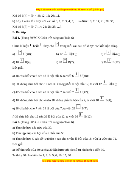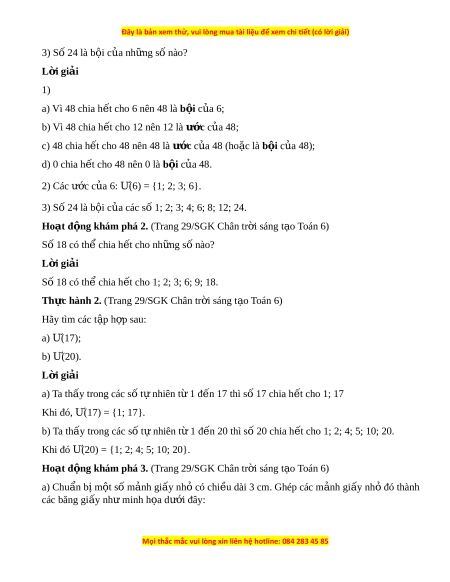ế cho 48 nên 0 là b i ộ c a 48. ủ 2) Các ư c c ớ a ủ 6: ( Ư 6) = {1; 2; 3; 6}. 3) Số 24 là b i ộ c a các ủ s 1; ố 2; 3; 4; 6; 8; 12; 24. Hoạt đ ng k ộ