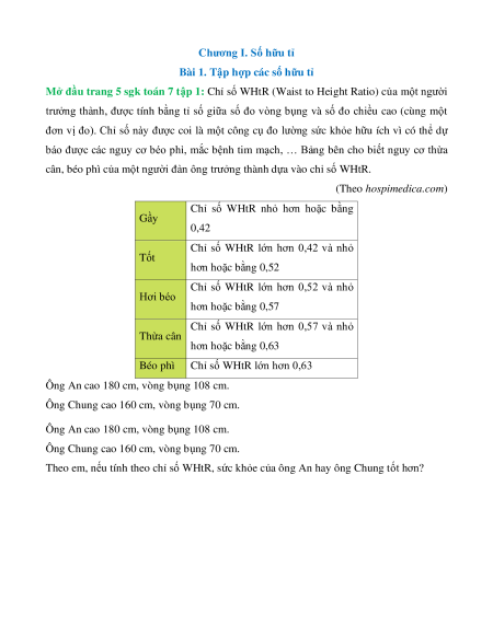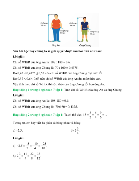Hoạt động 1 trang 6 sgk toán 7 tập 1: Tính chỉ số WHtR của ông An và ông Chung. Lời giải: