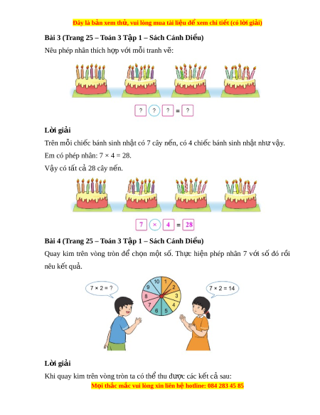 Bài 3 (Trang 25 – Toán 3 T p 1 – Sách C ậ ánh Di u ề ) Nêu phép nhân thích h p ợ v i ớ m i ỗ tranh v : ẽ L i ờ giải Trên mỗi chi c bánh s ế inh nh t ậ có 7 cây n n, có 4 chi ế c bánh s ế inh nh t ậ nh v ư y ậ .
