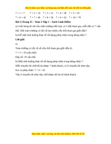 Bài 5 (Trang 25 – Toán 3 T p 1 – Sách C ậ ánh Di u ề ) a) Gi i ả bóng đá nữ c a ủ m t ộ trư ng ờ ti u ể h c ọ có 5 đ i ộ tham gia, m i ỗ đ i ộ có 7 c u ầ th . H ủ i ỏ toàn trư ng có t ờ ất cả bao nhiêu c u t ầ h t ủ ham gia gi i ả đ u? ấ b) Kể m t ộ tình hu ng t ố h c t ự ế s d ử ng phép ụ nhân trong b ng ả nhân 7. L i ờ giải a) Toàn trư ng ờ có tất c s ả ố cầu th t ủ ham gia gi i ả đ u l ấ à: 7 × 5 = 35 (cầu th ) ủ Đáp số: 35 cầu th . ủ b) M t ộ tình hu ng t ố h c ự t s ế ử d ng phép nhân t ụ rong b ng nhân 7: ả Mỗi chuy n đò ch ế ở tối đa đư c
